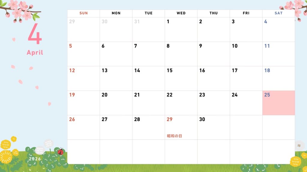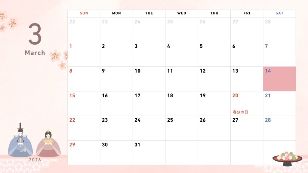 ※ カレンダーに表示されているピンクの日が営業日です。
